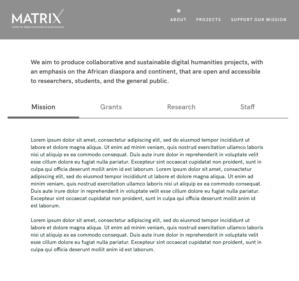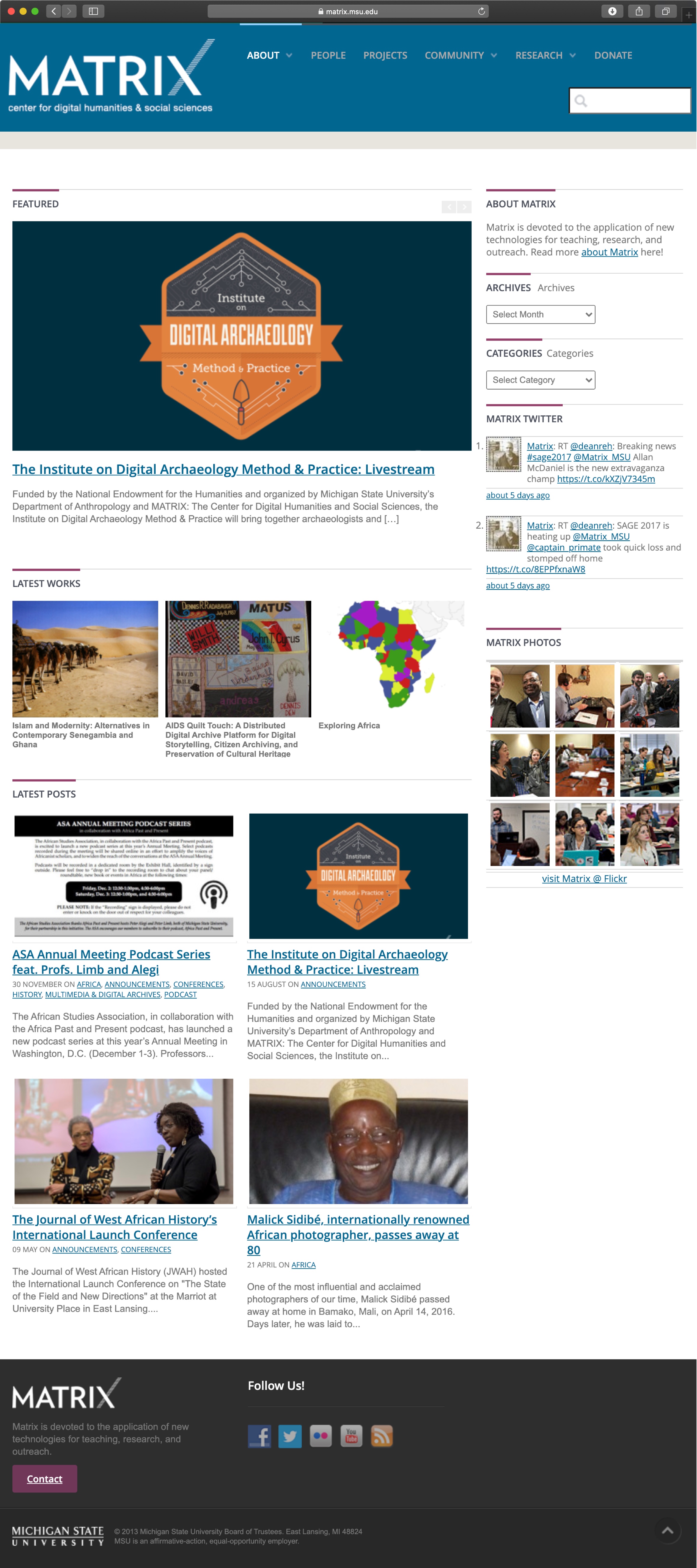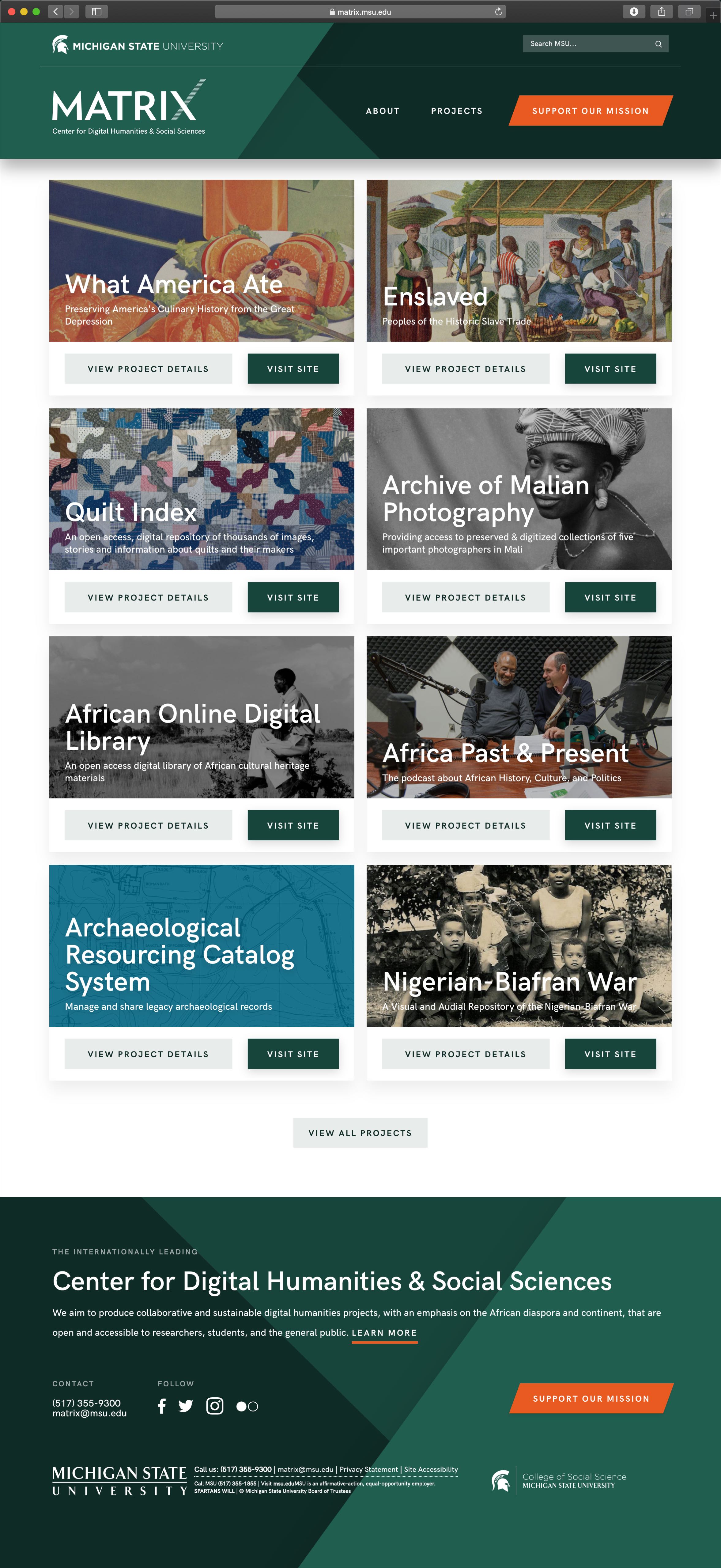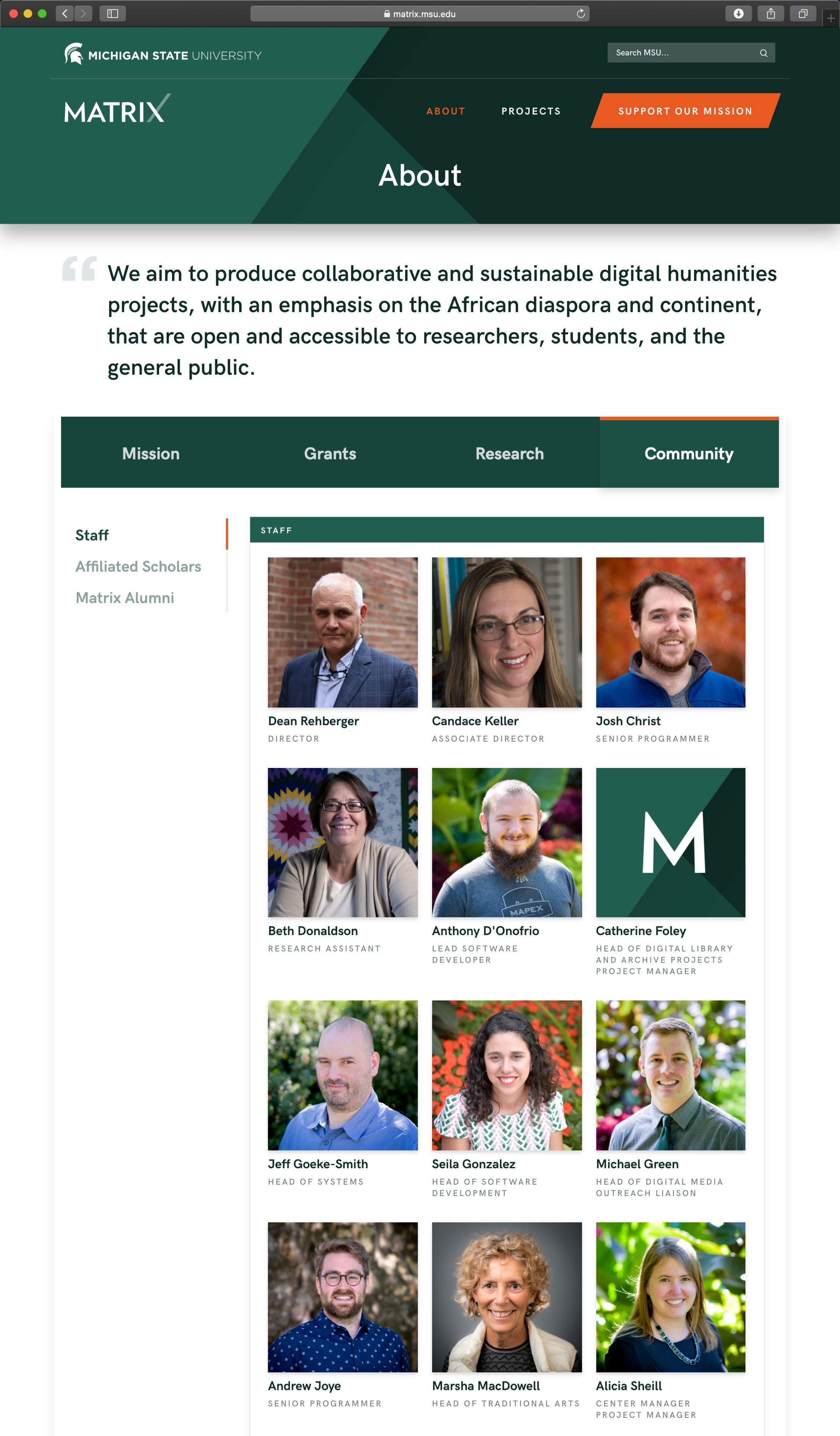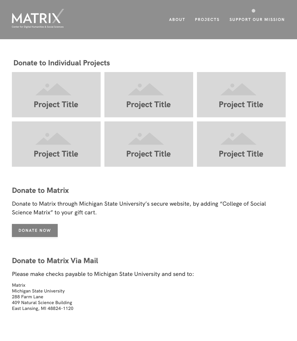 After a thorough review of user analytics on how users were using matrix.msu.edu, we dicovered that many features were going untouched. So we removed several pages, including the site's blog/news setup and it's search functionality, and simplified the site heirarchy into four main views; Home, About, Projects, and Support.
