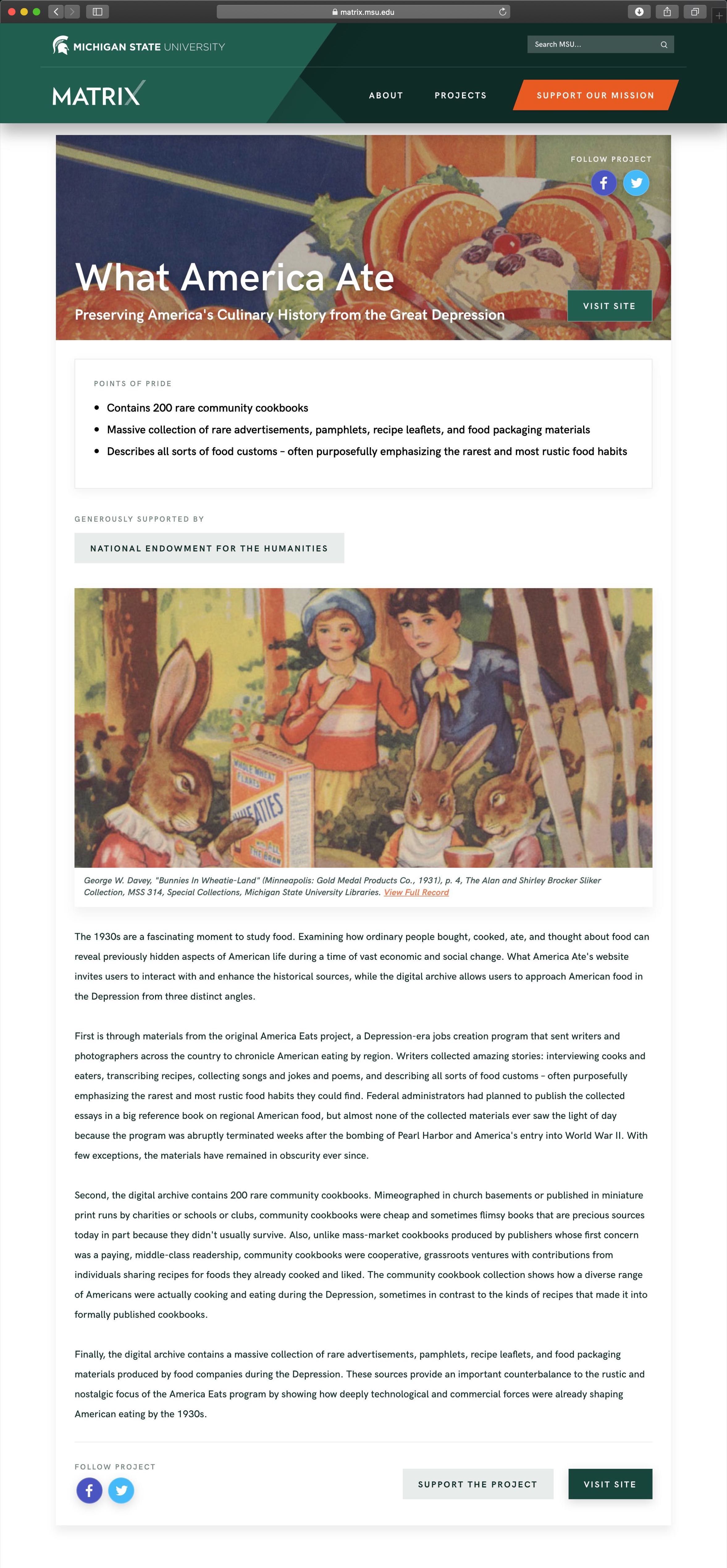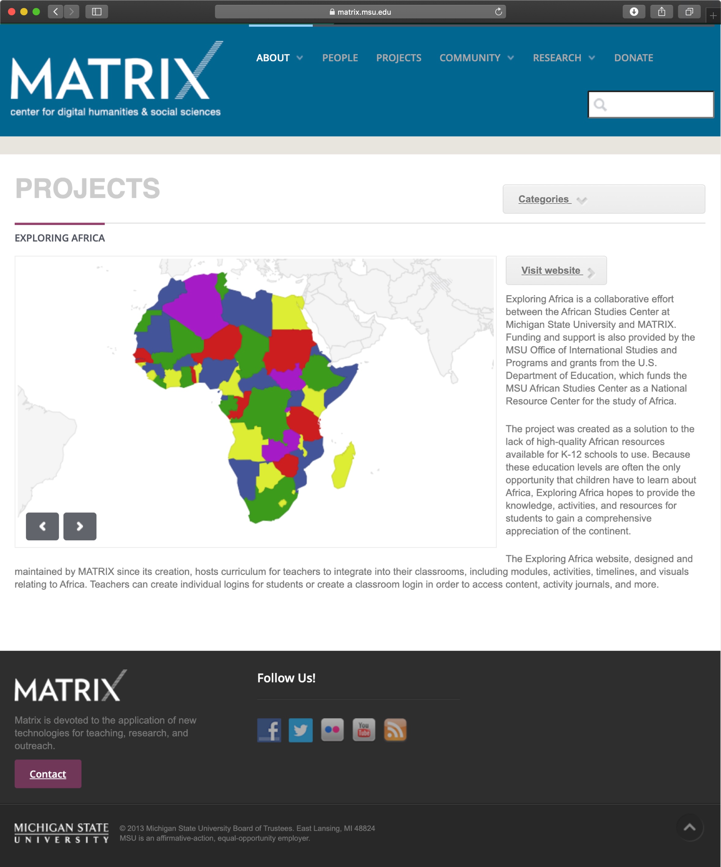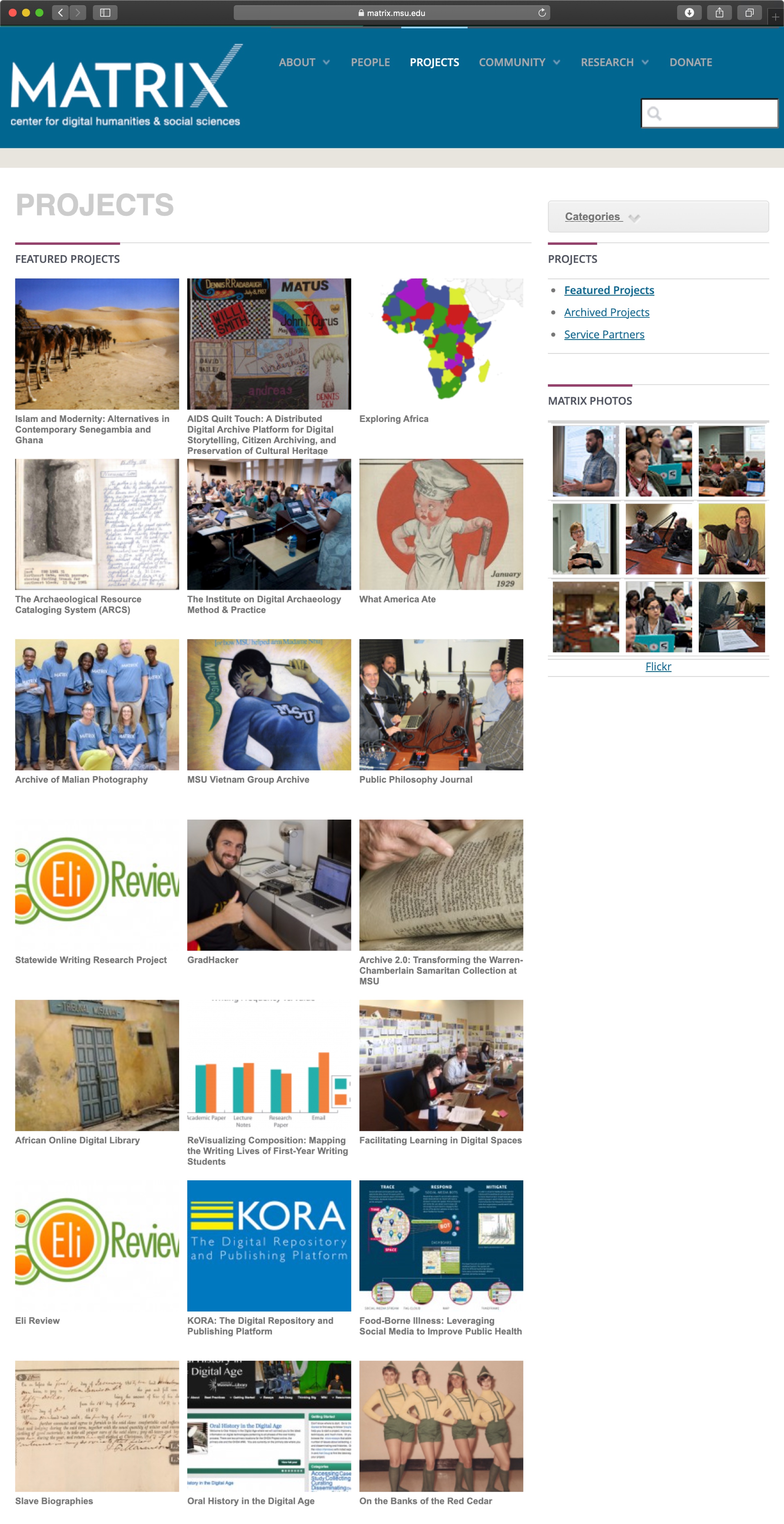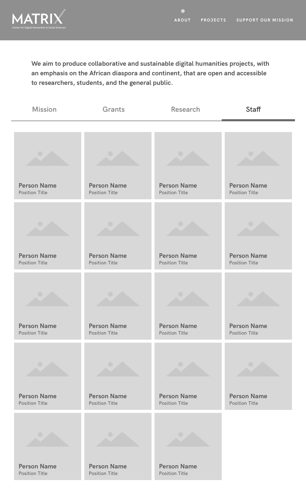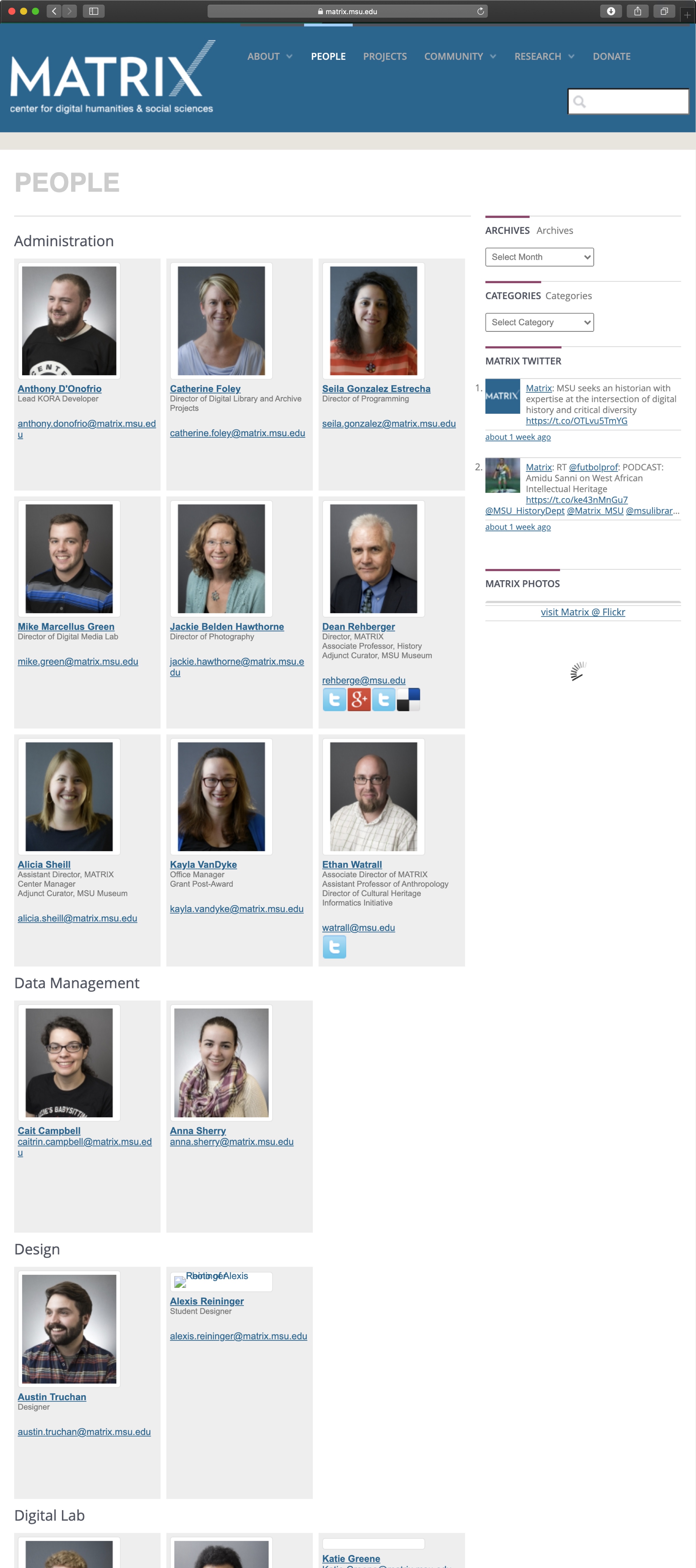 After a thorough review of user analytics on how users were using matrix.msu.edu, we dicovered that many features were going untouched. So we removed several pages, including the site's blog/news setup and it's search functionality, and simplified the site heirarchy into four main views; Home, About, Projects, and Support.