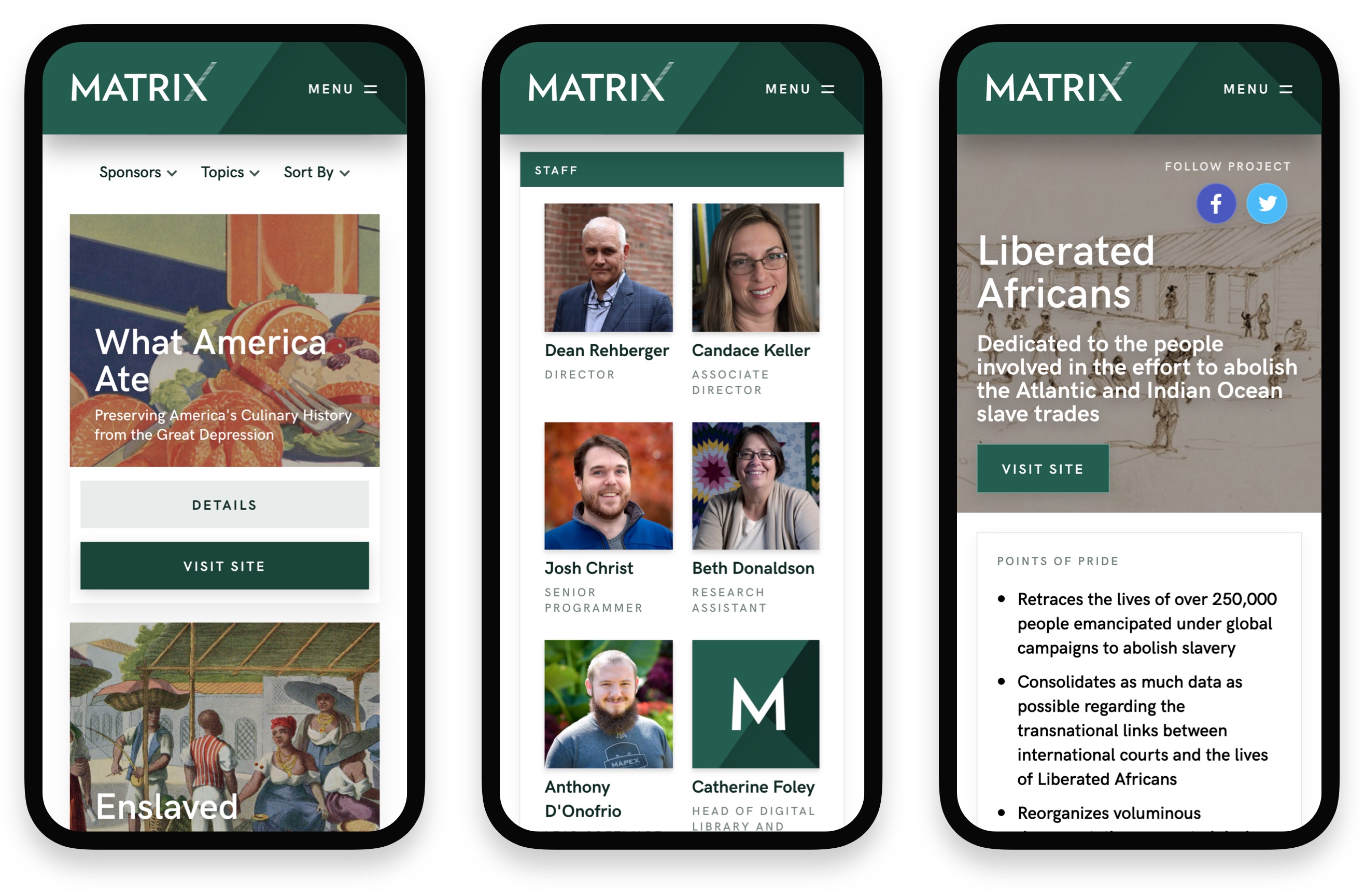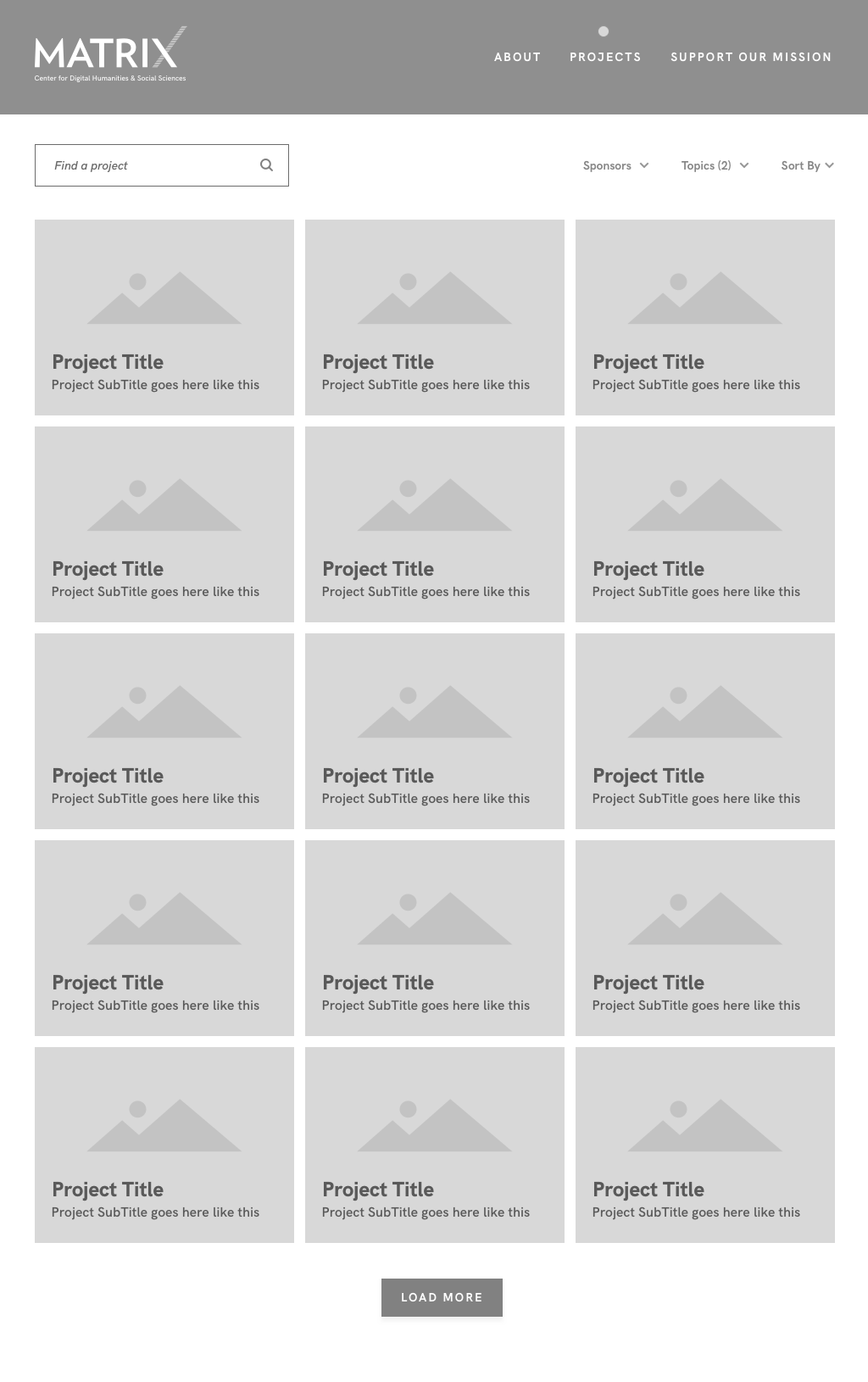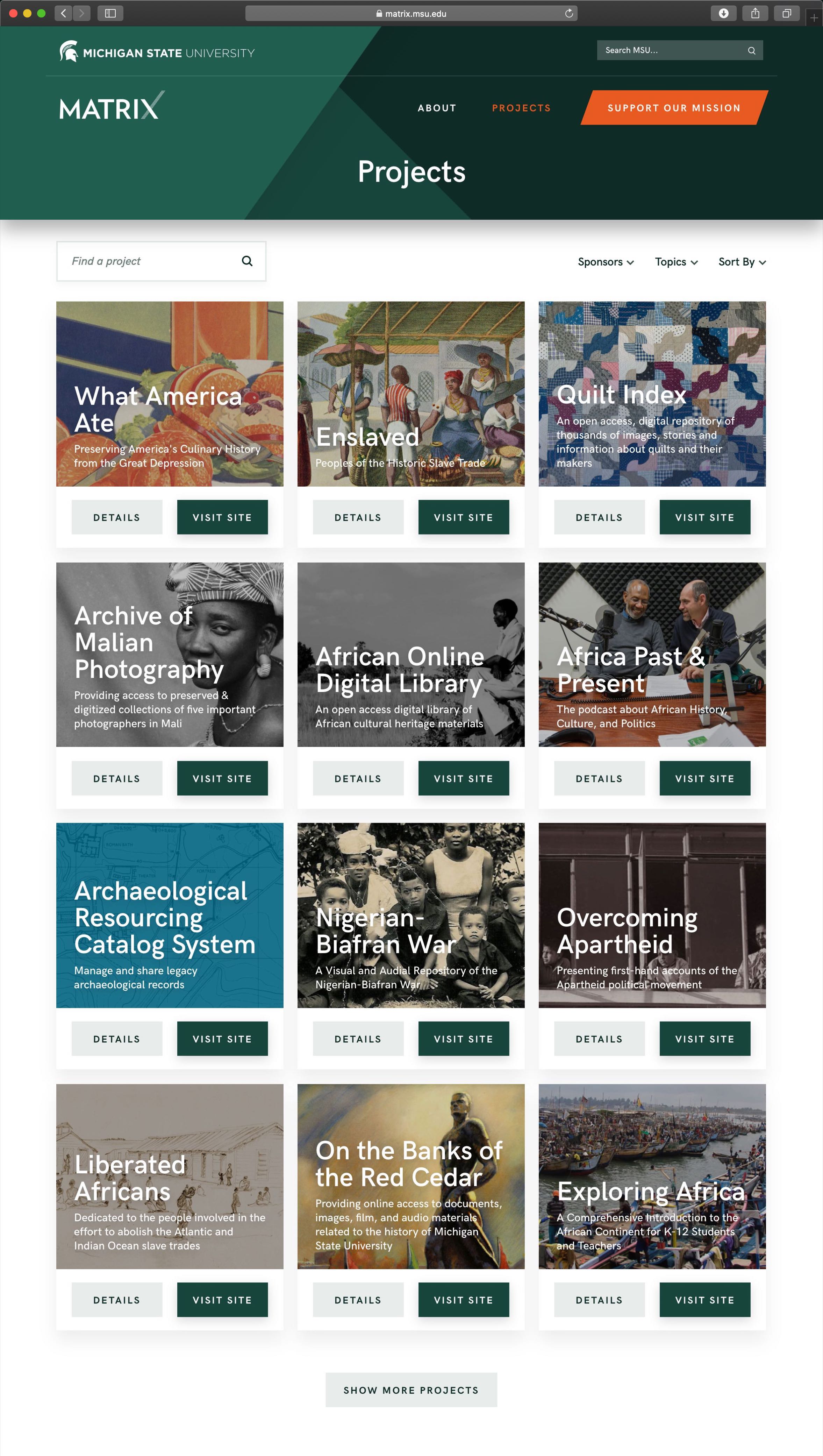 Matrix has over 100 different projects ranging back to the early 1990's. With so many projects we wanted to include a way to easily view and filter through them. The new Projects page now offers a way to search by keyword, filter by topic, or filter by sponsor.