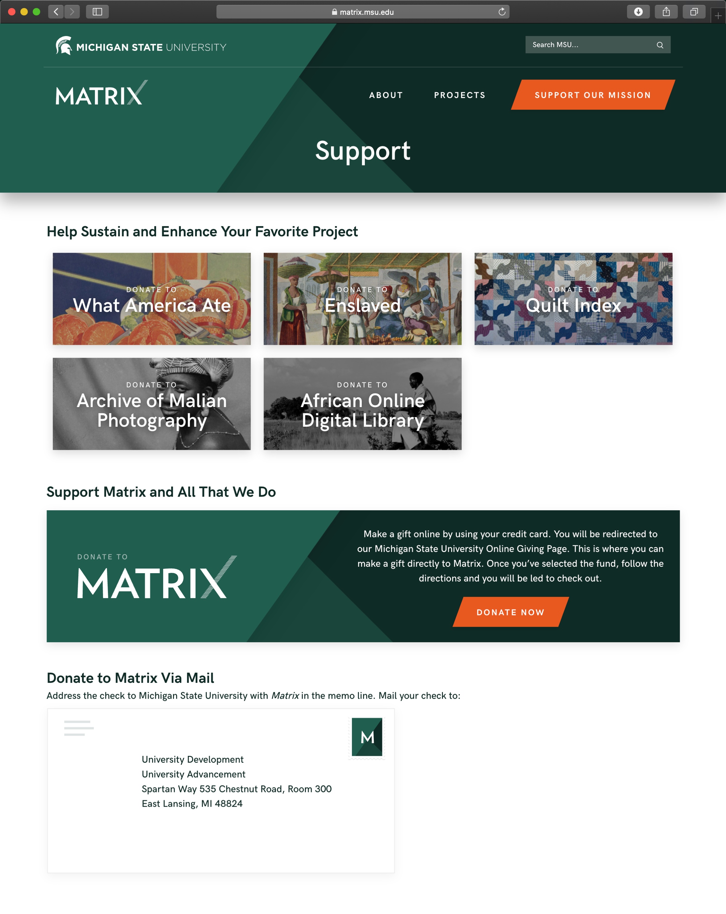 The Donate to Matrix section was updated to have a greater visual impact, featuring a banner with the site's new branding. The Donate via Mail section was also made more engaging, by adding a subtle envelope with a stamp to enclose the address.