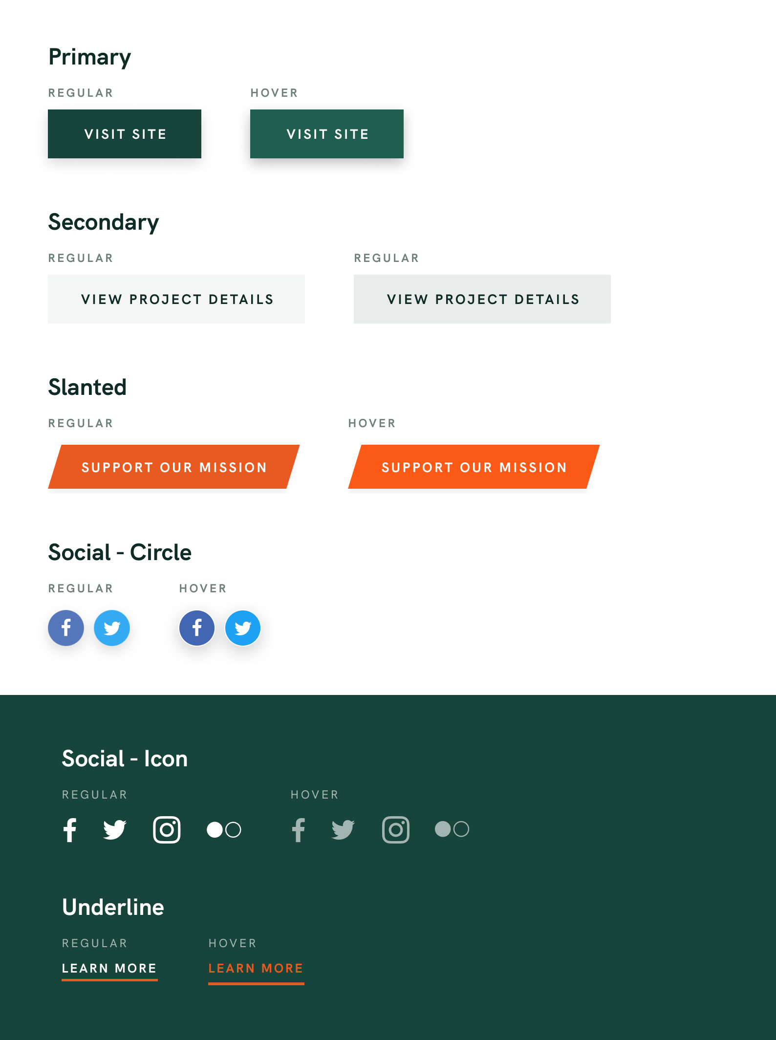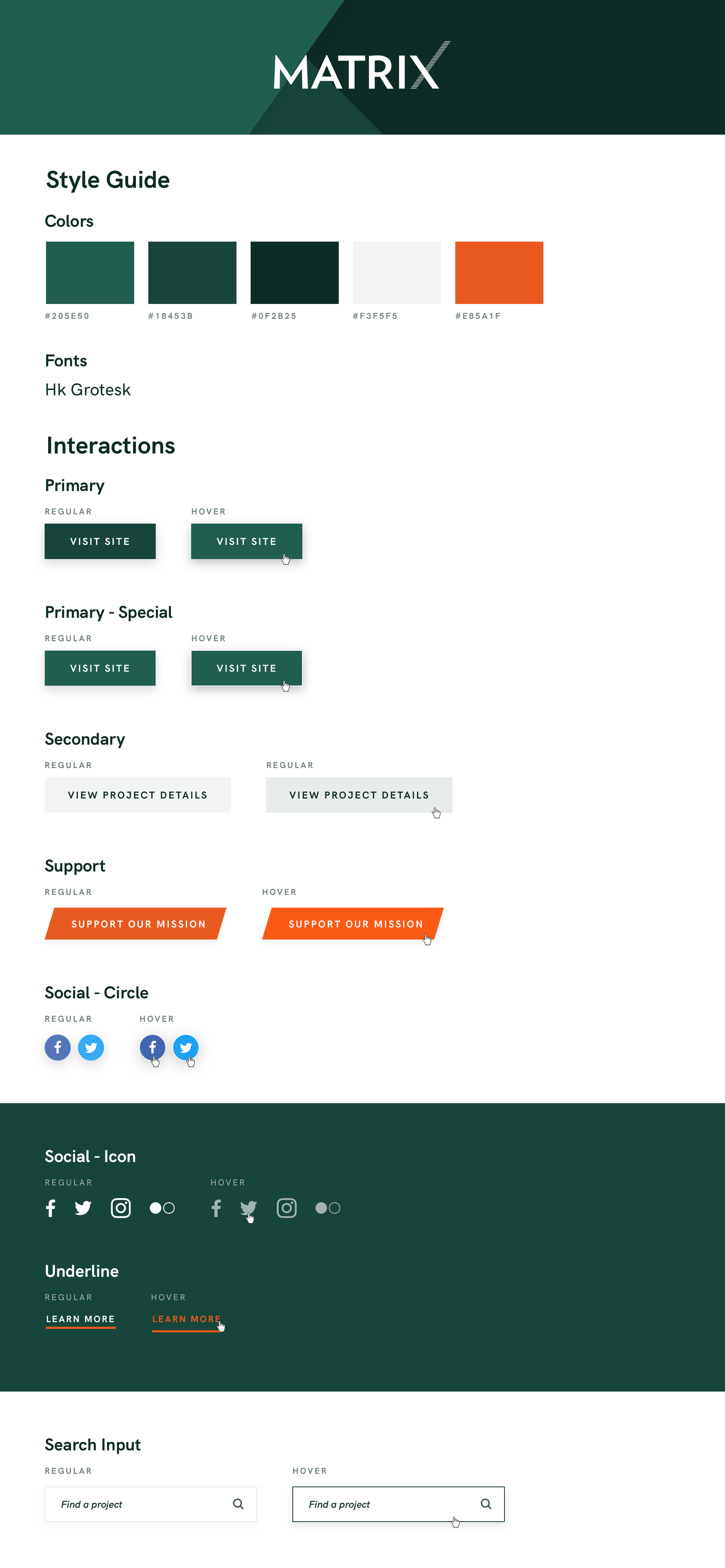 The new colors used in the redesign were based off of Michigan Statue University's green in order to fit within their branding. As a department of MSU, we felt this consistency was important. Using the colors and arranging them at various angles helped connect them to the angles of the Matrix logo, as well as provide some depth. We also wanted to make sure that Matrix held it's own identity within the MSU brand, so we added a pop of orange to act as our accent color, which both compliments and breaks away from the MSU brand. The following is a simple brand guideline along with interaction examples. View Figma File