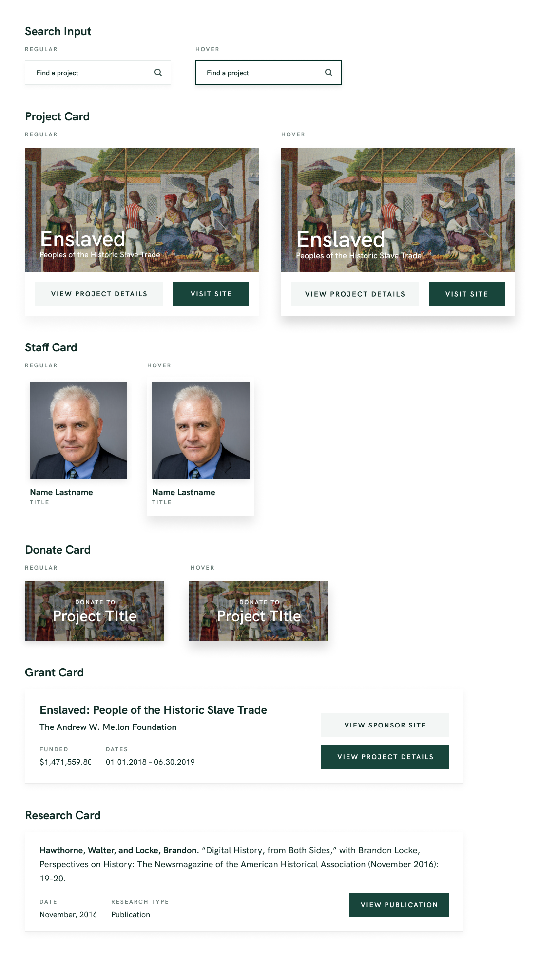 The updated About page was designed in a way so our mission statement is front and center on all about pages to make it clear what we are all about. We also simplified our About page down to four sections: Mission, Grants, Research and Staff. Our main staff section also saw a major update, with a clean grid of staff cards, that are clickable to reveal more information.