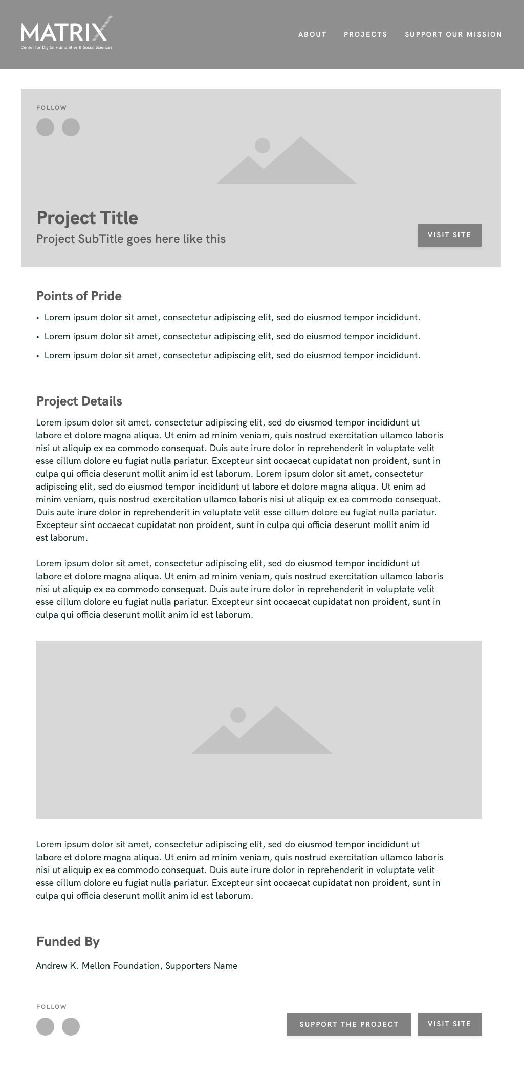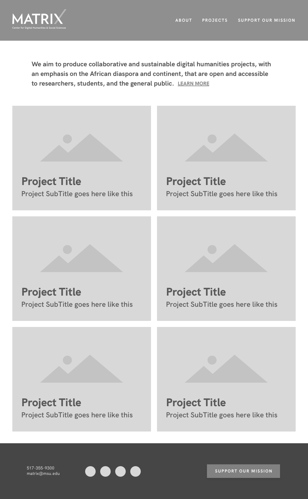 The final designs for Matrix's site design can be seen below. Changes that occurred after the wireframe process are pointed out. The best way to experience the final design is seeing it live at matrix.msu.edu