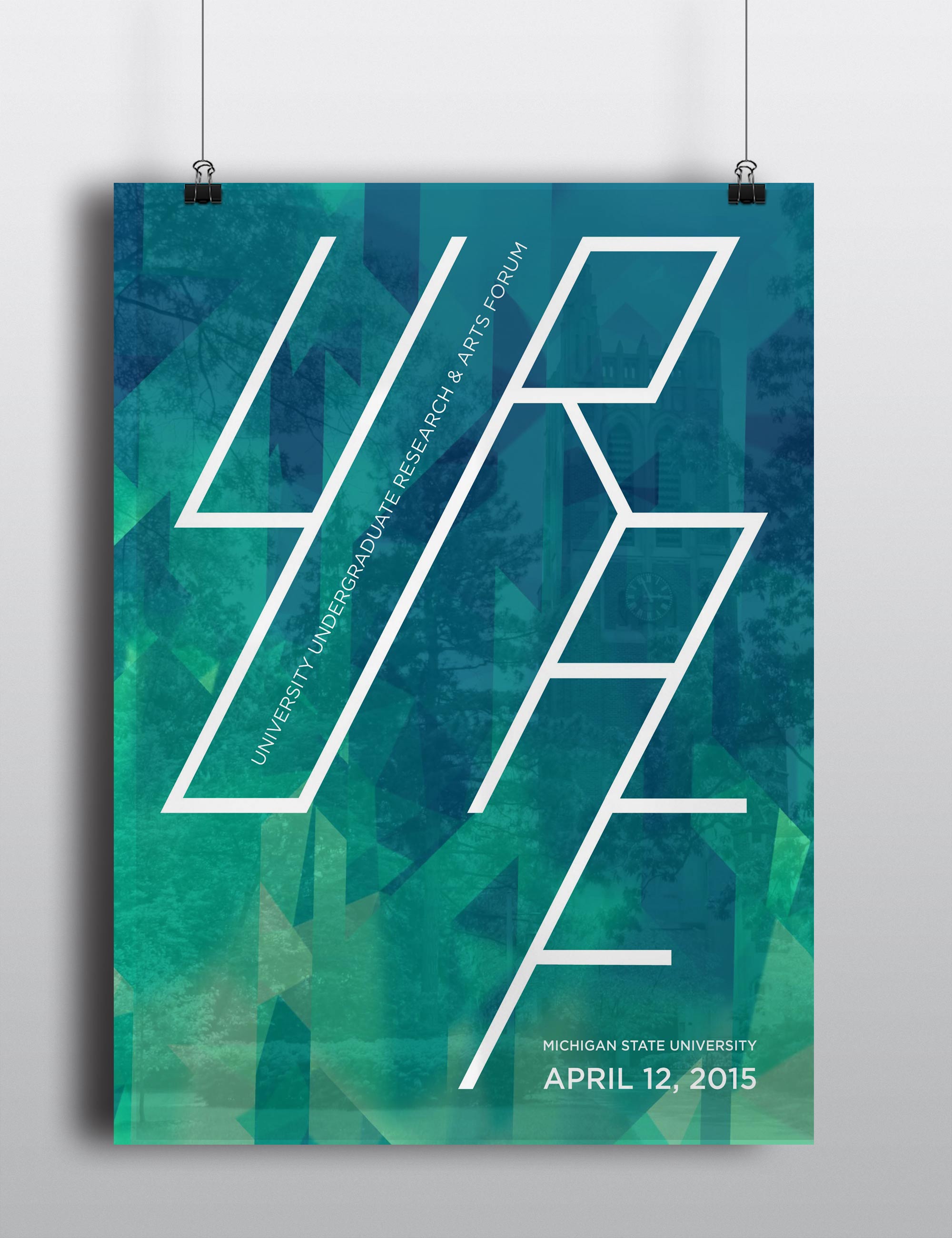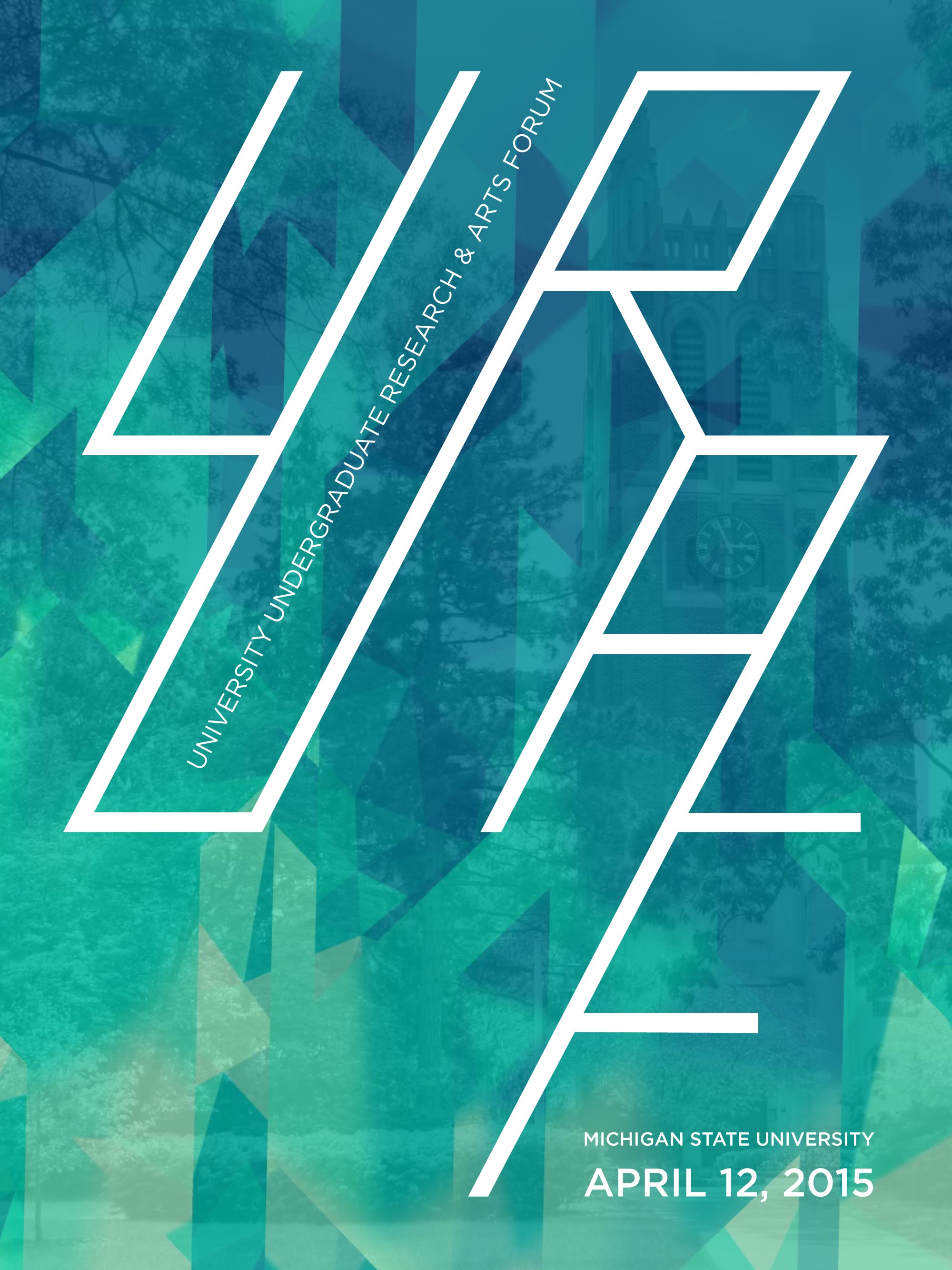 The annual University Undergraduate Research and Arts Forum (UURAF) provides Michigan State undergraduate students with an opportunity to showcase their scholarship and creative activity. Held each spring in the historic MSU Union, UURAF brings together an intellectual community of highly motivated students to share their work with faculty, peers, and external audiences. UURAF provides a unique educational opportunity for aspiring researchers. MSU undergraduates gain experience in presenting their research, answer questions about their work from audience members and guests, and receive constructive feedback from judges. As an active member of MSU AIGA, we were given the opportunity to design the poster for the 2015 UURAF. You can see my process below for the type treatment.